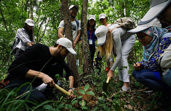 6月4日,在南京郊外一处山林,来自中国药科大学、南京中医药大学的外国留学生们在学习挖掘中草药。当日,35名来自美国、英国、智利、泰国等国家和地区的外国留学生,在秦淮区中医医院医生及南京中医药大学老师的带领下,走进南京郊外分布着各种中草药的深山老林,采草药、识百草,了解中草药的起源和魅力,感受中医药文化。