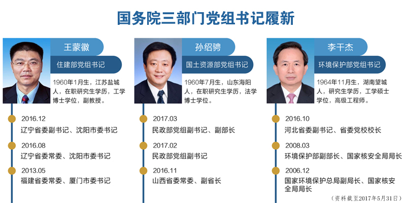 31日,国务院三部门党组书记调整。河北省委副书记李干杰被任命为环保部党组书记,此前已调任北京市委副书记、代市长的陈吉宁被免去环保部党组书记职务;民政部党组副书记、副部长孙绍骋调任国土资源部党组书记,国土资源部部长姜大明被免去国土资源部党组书记一职,改任党组成员;辽宁省委副书记、沈阳市委书记王蒙徽调任住建部党组书记,住建部部长陈政高不再担任。