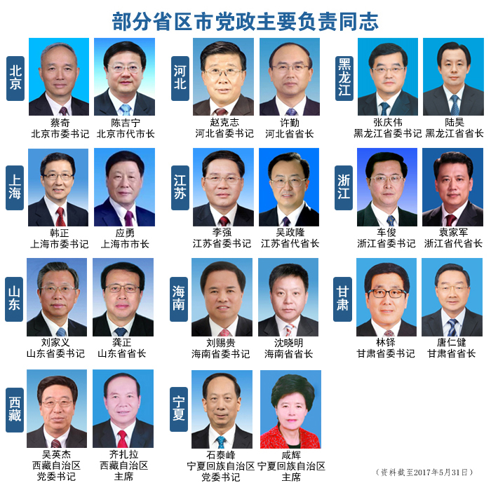 5月27日,北京市党政“一把手”调整。郭金龙不再兼任北京市委书记职务,蔡奇任北京市委书记。至此,2017年以来,已有七省区市党委书记履新,他们是:北京市委书记蔡奇、山东省委书记刘家义、甘肃省委书记林铎、宁夏回族自治区党委书记石泰峰、黑龙江省委书记张庆伟、浙江省委书记车俊和海南省委书记刘赐贵。