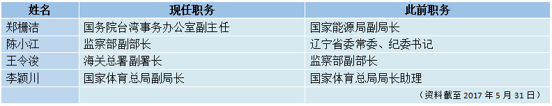 5月,国务院两次任免国家工作人员,郑栅洁、陈小江、王令浚、李颖川4人履新。其中,辽宁省纪委书记陈小江调任监察部副部长,监察部副部长王令浚调任海关总署副署长,监察部领导班子“一进一出”。