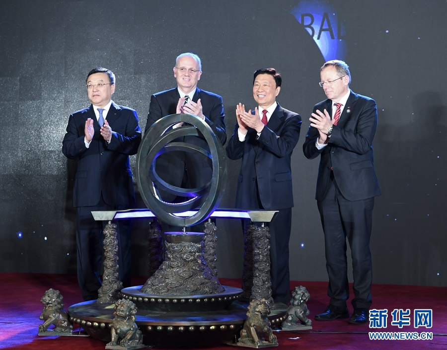 6月6日,2017年全球航天探索大会在北京开幕。中共中央政治局委员、国家副主席李源潮出席开幕式。这是李源潮(右二)与中外嘉宾在大会启动仪式上。新华社记者张领摄