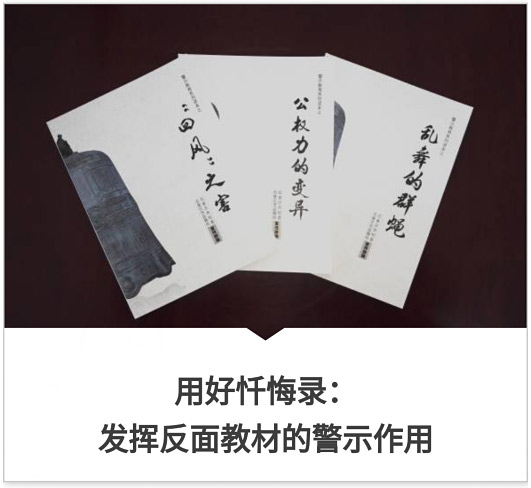 各地也有不少特色做法。例如在黑龙江,贪腐官员受审,让相关领导干部和家属旁听现场忏悔,许多人听完以后感慨万分:“旁听一次庭审,从政终身受益!”又如河南省纪委今年计划对党员领导干部违纪违法典型案例实行“一案四警示”,即精选省管干部违纪违法案例,编印忏悔录、撰写剖析材料、采写纪实通讯、拍摄警示教育片,进一步深化典型案例的警示教育作用。