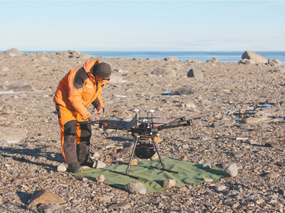 第三十三次南极考察队科考队员朱李忠在难言岛上利用旋翼无人机进行倾斜摄影测量。新华社记者 荣启涵摄