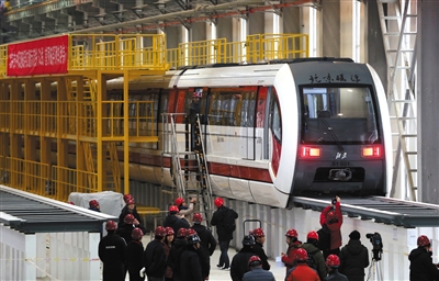 2016年12月25日,S1线石门营车辆段,首列磁浮列车到京,经过调试后预计2017年实现载客运行。记者 薛珺 摄