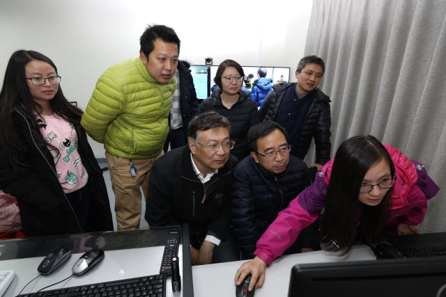 2016年12月22日,在云南丽江观测站,潘建伟(前排右二)、王建宇(前排左一)、彭承志(后排右一)等科研人员在做实验。新华社记者 金立旺 摄