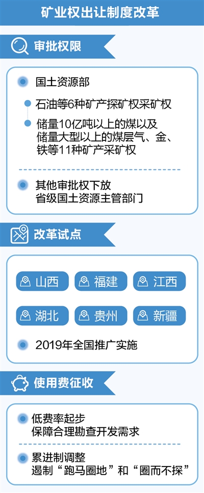 《方案》要求选取山西、福建、江西、湖北、贵州、新疆等6个省(自治区),开展包括下放审批权限在内的矿业权出让制度改革试点。据介绍,试点为期两年,通过试点总结经验,推进相关法律法规修订,出台和修改完善相关规范性文件后,计划2019年在全国推广实施。