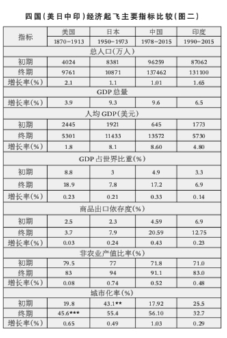 在图二我特别例举了四个重要国家,第一个是美国,它的经济起飞时期是1870—1913 年,用了40年时间完成从经济起飞到世界强国的过程,年均经济增长率为4%。第二个是日本,在1950-1973年经济起飞,年均经济增长率高达9.3%,这就是所谓的“日本奇迹”,超过了“美国奇迹”。第三个就是中国,从1978年到2015年,年均经济增长率为9.6%,也创造了“中国奇迹”,超过了“日本奇迹”。第四个是1991-2015年印度的经济起飞,年平均增长率为6.5%。