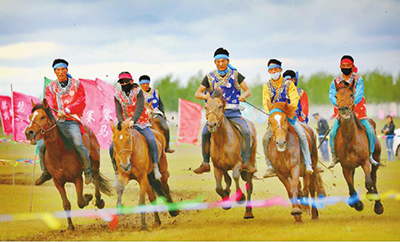 6月18日,鄂温克族群众在草原上赛马。当日,在黑龙江省讷河市兴旺鄂温克民族乡百路村“噶布喀”草原上,身着节日盛装的鄂温克族同胞载歌载舞庆祝第24届鄂温克族“瑟宾节”开幕。“瑟宾”一词是鄂温克语,意为“欢乐、祥和”。 张亮摄/光明图片