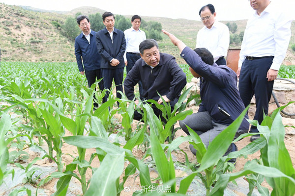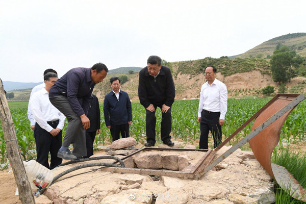 习近平走进赵家洼村的一片农田,察看玉米和芸豆长势。村支书告诉总书记,因为干旱,庄稼植株矮小,产量很低,村民们靠天吃饭。总书记向村民了解了地膜的保墒作用。总书记来到村里唯一的一口饮水井旁,登上用石块垒起的井台,仔细察看井里蓄水的情况。