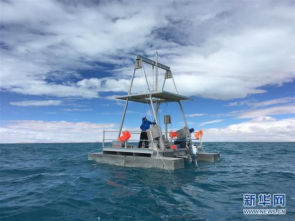 科考队员许腾在色林错湖面上的科研平台工作(6月19日摄)。 新华社记者 王沁鸥 摄