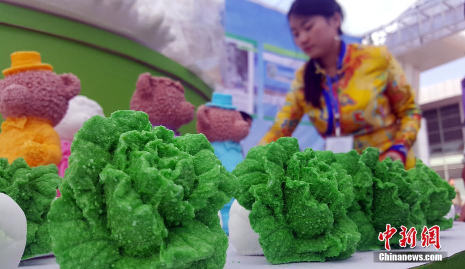 6月22日,160多个精美盐雕亮相正在举行的第十八届中国·青海绿色发展投资贸易洽谈会(简称“青洽会”)。这些盐雕全部采用产自柴达木盆地的食用盐,雕塑中既有关公,还有维纳斯,更有萌萌哒的小熊、小猪等造型。此次亮相的盐雕共有160多个品种,价格从10元人民币到1万元人民币不等,精美的盐雕吸引了大批市民购买。青海省柴达木盆地盐湖众多,在已查明的33个盐湖中,氯化钠储量达3300亿吨,占全国湖盐储量的85%。图为用食用盐雕塑成的白菜。