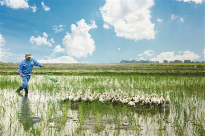 5月插秧后,工作人员放鸭子进田捕虫。王汉超摄