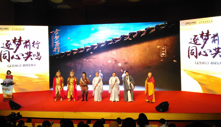 图为发布会上,《玄奘西行》的主要演职人员与记者交流互动