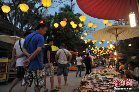 资料图:云南西双版纳“告庄西双景”内,逛夜市的游客。 中新社记者 任东 摄