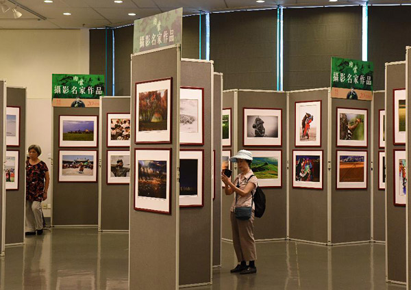 6月28日,香港市民在展览上参观摄影名家作品。当日,“风情丝路彩墨香江”当代名家作品展,香港、内蒙古两地摄影比賽暨联展在香港中央图书馆展览馆举行开幕典礼。这是香港各界庆典委员会主办的庆祝香港回归祖国20周年系列活动之一。上百名书画、摄影界人士出席活动。
