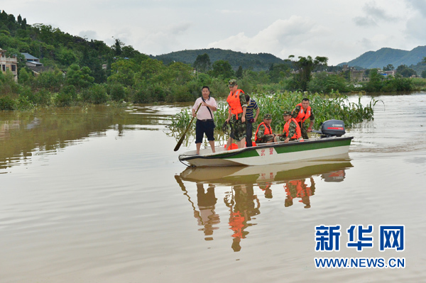 7月2日,在广西全州县黄沙河镇水车村,武警官兵和当地干部乘船巡查群众受困地点。近日,受持续强降雨天气影响,广西全州县湘江、灌江、万乡河汇水后水位持续上涨,沿岸及下游村庄严重受灾。灾情发生后,武警官兵和当地党员干部组成抗洪抢险队,深入一线展开抢险救灾和群众转移安置工作。新华社发(李绚丽 摄)