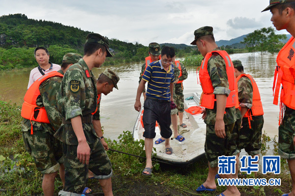 融水苗族自治县城遭强降雨袭击,融水镇大量居民房屋一楼淹没在洪水之中。当地武警和党员干部组成抗洪抢险突击队,队员贾志雄跳入洪水中,背着新兴街90岁的居民胡翠菊,一步步挪到救援船上,转移到安全地带。