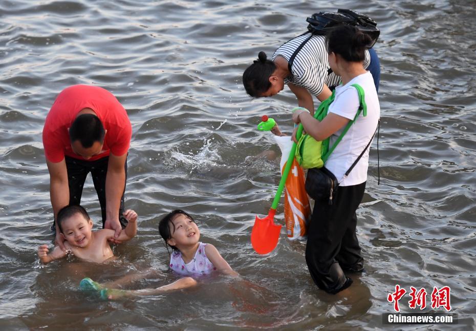 7月4日傍晚,市民们带着小孩在海边戏水消暑。连日来,受副热带高压影响厦门地区持续高温,市民们纷纷带着小孩来到海边戏水消暑。 张斌 摄