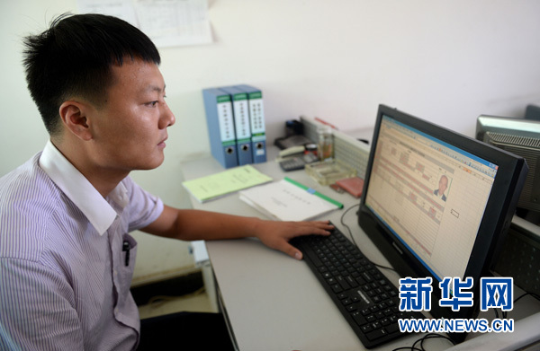 陕西信合的工作人员在审核“一卡通”担保贷款人员的资料。村民在申请贷款后3天就能得到回复,符合条件的5天即可拿到贷款(6月29日摄)。新华社记者 刘潇 摄