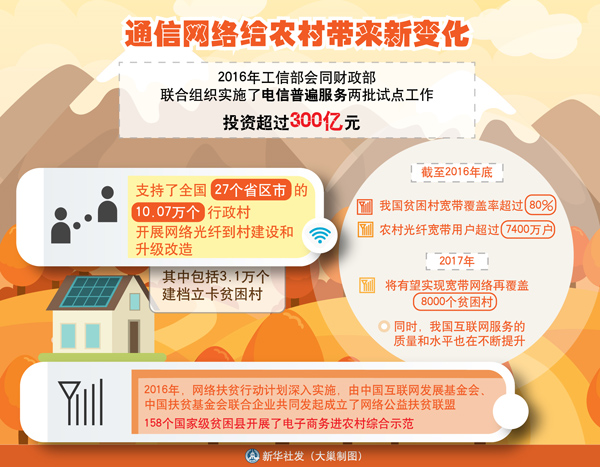 近年来,我国加大对中西部地区和农村贫困地区移动互联网基础设施建设的投资力度,加快推进贫困地区网络全覆盖,着力降低贫困群众享受信息生活门槛。截至2016年底,我国贫困村宽带覆盖率超过80%,农村光纤宽带用户超过7400万户。今年将有望实现宽带网络再覆盖8000个贫困村。同时,我国互联网服务的质量和水平也在不断提升。