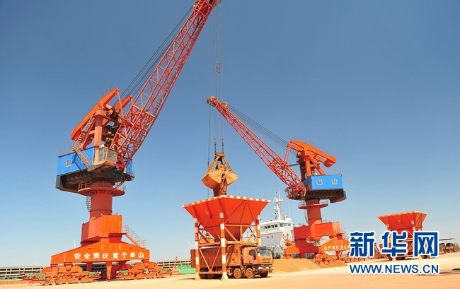 图为几内亚来的铝矾土从滨州套尔河港区上岸。(烟台港集团供图,新华网发)