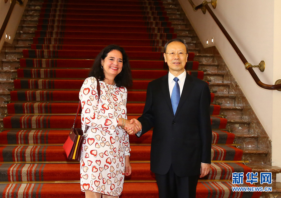 7月4日,在比利时首都布鲁塞尔,中共中央书记处书记、全国政协副主席杜青林(右)会见比利时联邦参议长德弗莱涅。应德弗莱涅邀请,杜青林率中共代表团于7月4日至5日访问比利时。 新华社记者龚兵摄