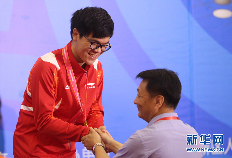7月8日,柯洁(左)在颁奖仪式上。当日,第十三届全运会围棋项目专业男子个人赛结束第七轮较量。云南队选手柯洁七战全胜,积14分夺得冠军。 新华社发(张誉东 摄)