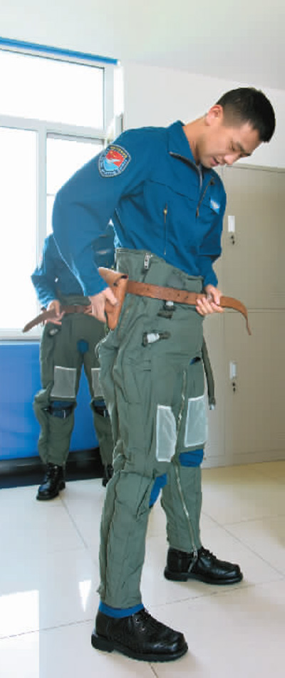 空军飞行员起飞前穿减压服。