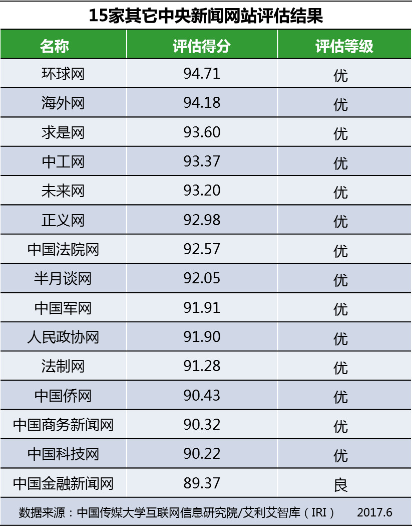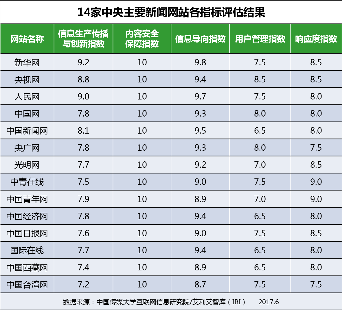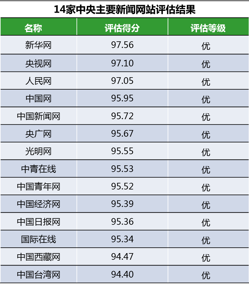 14家中央主要新闻网站表现优,总分平均值为95.76。新华网、央视网、人民网位列前三甲。