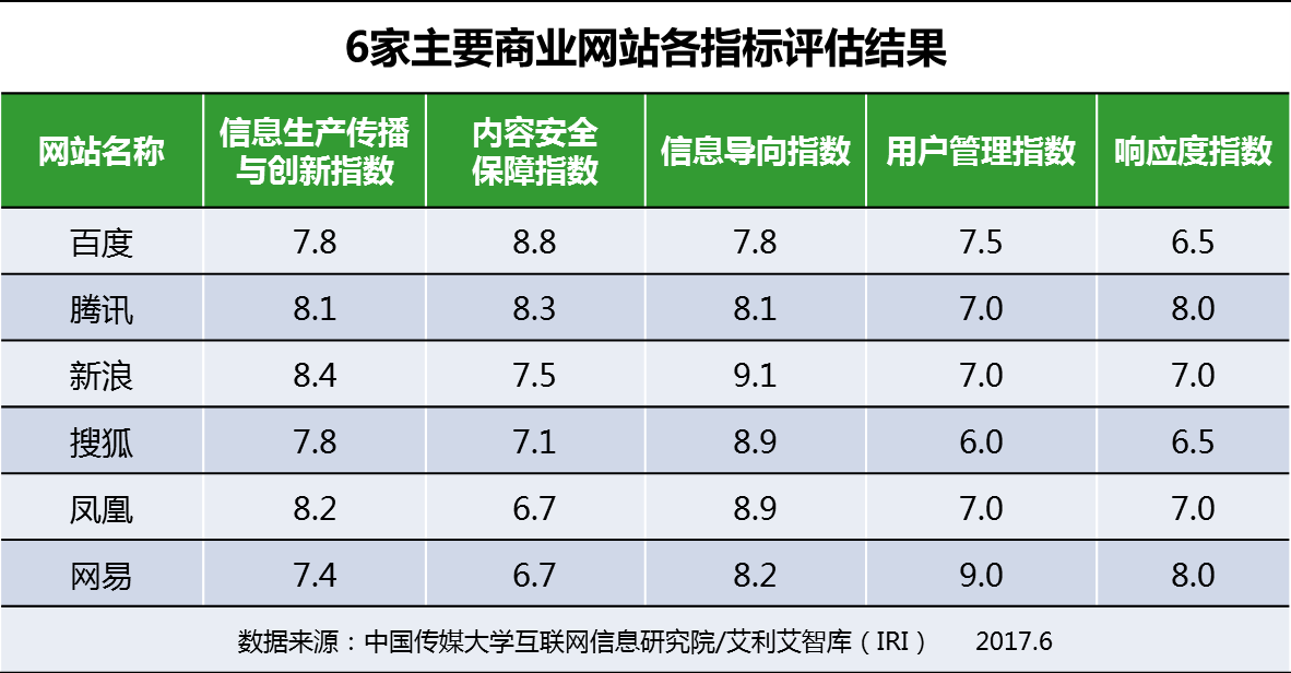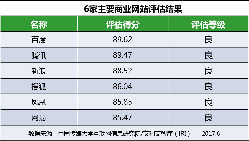 6家主要商业网站整体表现良,总分平均值为87.50,较上月差异不大。百度、腾讯、新浪网站信息生态指数位列主要商业网站前三甲。
