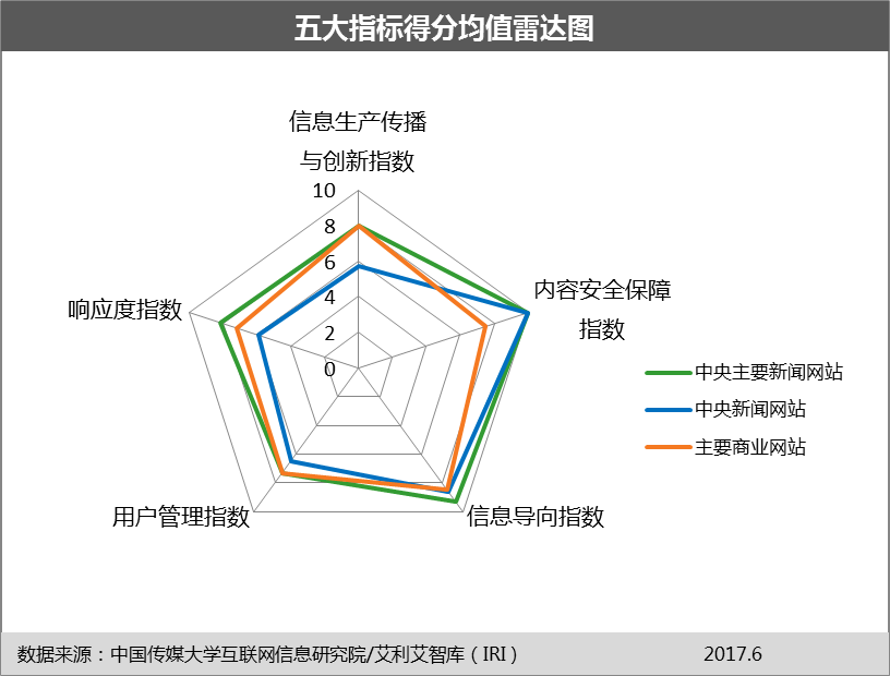14家中央主要新闻网站信息生态较好,15家中央新闻网站次之,6家主要商业网站信息生态指数均分较低。从五个指标得分均值来看,中央主要新闻网站各指标得分比较均衡;中央新闻网站在信息导向与内容安全方面表现较好,在用户管理方面均值低于中央主要新闻网站、主要商业网站,信息生产传播与创新、响应度方面与二者相比还存在较大差距;在内容安全保障方面,主要商业网站明显落后于中央主要新闻网站、中央新闻网站;信息生产传播与创新、用户管理方面,主要商业网站与中央主要新闻网站水平较为接近。