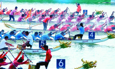 7月15日上午,第十三届全运会群众比赛龙舟决赛在湖南常德柳叶湖举行,决赛为期3天,共有来自全国各地的24支队伍参赛,设有22人龙舟和12人龙舟两个大项,各分男子组和女子组两个组别,分别在100米、200米、500米直道赛3个项目上展开角逐。 陈自德摄/光明图片