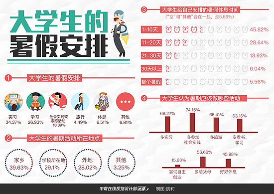 中国高校传媒联盟调查显示,45.82%的受访者暑假给自己预留的休息时间不到10天,6.04%的受访者准备休息超过30天,5.56%的受访者准备将整个暑假都用来休息。
