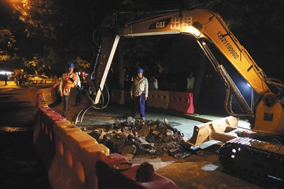 7月12日,景山西街,工人正在破土,为架空线入地做准备。