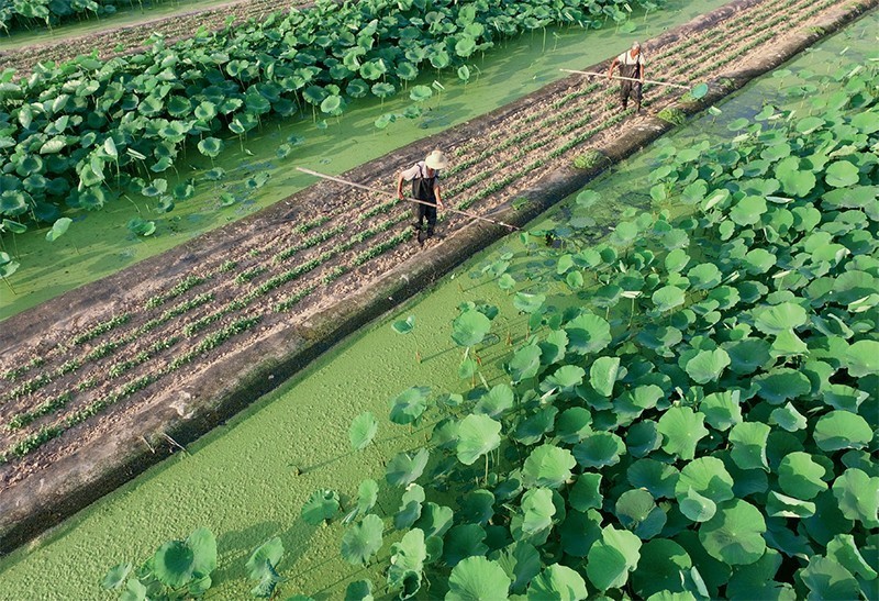 ▲ 6月17日,河北省临西县富西王庄村富临生态养殖合作社的社员在莲藕泥鳅套养基地清理水草(杨世尧 摄)