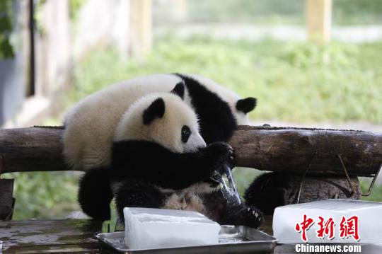 清晨9时许,重庆动物园熊猫馆的熊猫“集体出动”:趴在树枝上、躺在小水池里或坐在通风口处,享受着一天中难得的凉爽。看到饲养员开始发放用于玩耍的冰块时,熊猫们便拖着圆滚滚的身躯朝水池奔去,恨不得将整个身子趴在冰块上。