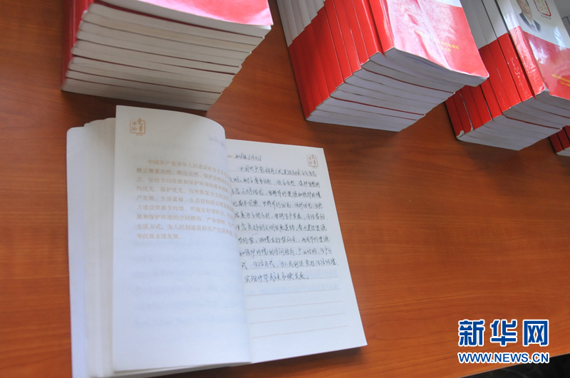 7月18日,网络媒体国防行记者团参观武警广东总队河源市支队和平县中队。图为中队官兵日常使用的《手抄系列讲话笔记本》。新华网记者 黄河摄