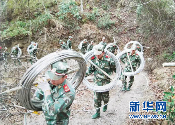 2008年2月,受冰冻灾害影响,和平县电网遭不同程度损坏,为加快抢修电路,和平中队官兵用自己双手将近10吨重的导线抬到近千米高的上陵羊角石峰地段。新华网发(和平中队供图)