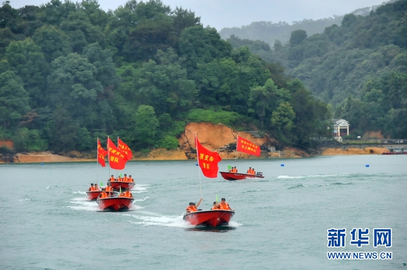 7月18日,记者随“同心共筑强军梦”网络媒体国防行采访团来到广东省河源市万绿湖,近距离观摩了武警广东总队河源支队水上救援演练。图为武警官兵驾驶冲锋舟进行编队战术演练和水上救援训练。新华网记者 黄河摄