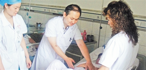欧阳栋(中)巡诊中为年轻医生进行技术指导。 (资料图片)