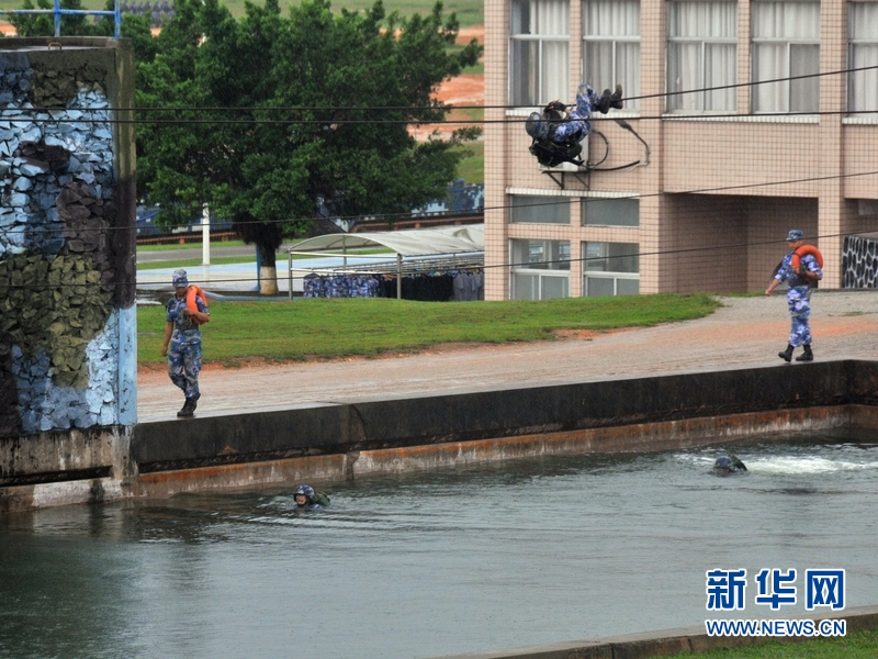 7月20日,记者随“同心共筑强军梦”网络媒体国防行采访团走近驻扎粤西的海军陆战队某旅,近距离观摩了障碍训练、轻武器射击、步兵战车战术训练等科目的精彩训练。图为陆战队队员们进行牵引横渡训练。新华网记者 黄河摄