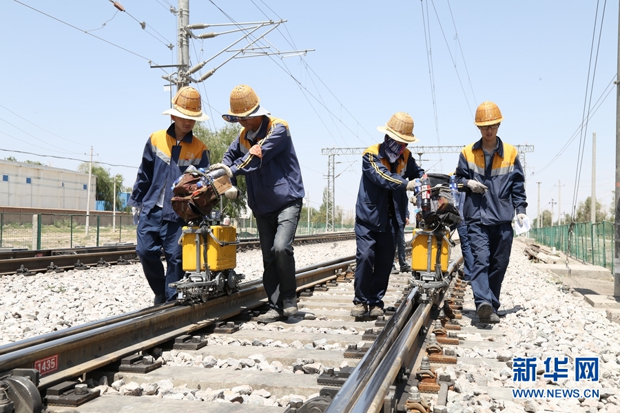 新华网北京7月21日电(韩家慧 孙杞明)暑运开始以来,甘肃兰新铁路线上武威工务段的气温节节攀升,35℃的高温天气已持续半月有余,最高气温一度达到41℃。有这么一群人,他们身穿蓝黄相间的工作服,每天天空泛起鱼肚白时就收拾妥当,整装出发,一直工作到下午三、四点钟才能吃口午饭。他们是一群跟钢轨打交道的人,每天穿着黄色的反光衣、带着检测仪器,行走于铁道线上:查看钢轨曲线是否圆润、直线是否笔直、内部是否有裂纹、螺丝是否松动。他们是有着“钢轨医生”之称的铁路钢轨探伤工。高温下,探伤工们一直奋战在管内的兰新铁路、干武铁路、兰新高铁的线路上,确保着钢铁大动脉的安全畅通。