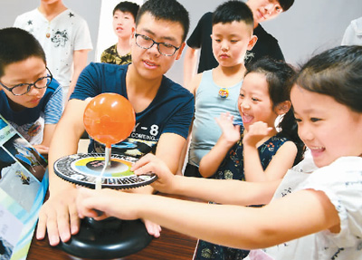 7月20日,是人类月球日,江苏大学志愿者走进江苏省镇江市金山街道红光社区,通过三球仪模型演示、宣传展板、视频短片等形式,指导小朋友了解人类与月球和太空之间的关系,在互动探究中学习相关的科普知识。图为志愿者指导小朋友通过三球仪模型演示学习太空科普知识。