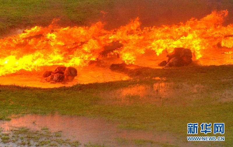 7月20日,记者走进驻扎粤西的海军陆战队某旅,近距离观摩了障碍训练、轻武器射击、步兵战车战术训练等科目的精彩训练。图为陆战队队员们穿越火障。新华网记者 黄河摄