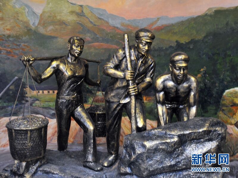 图中雕塑生动再现了上世纪五十年代初,连队进驻横琴岛之初,自力更生,努力改善驻防与生活条件的场景。新华网记者 黄河摄