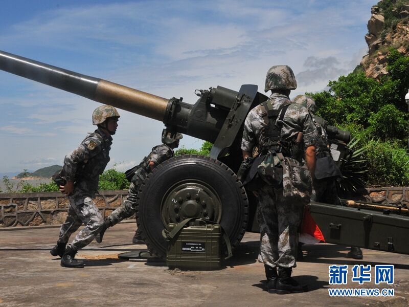 图为“钢八连”官兵在炎炎烈日下进行海防炮兵演练。新华网记者 黄河摄