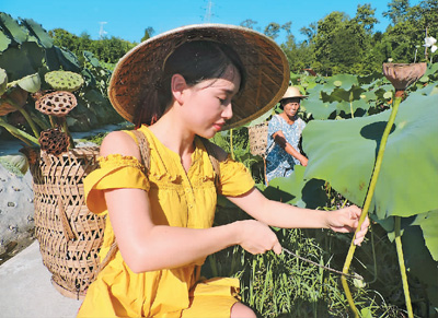 藕农在村莲藕种植基地忙着采收鲜莲蓬。