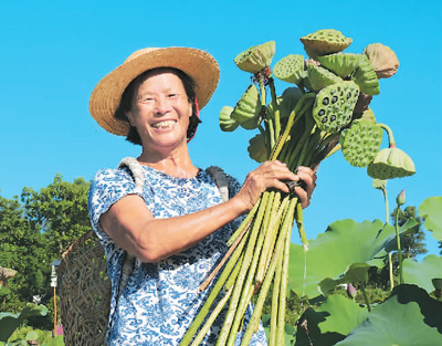 62岁藕农谢吉国展示新采收的莲蓬。
