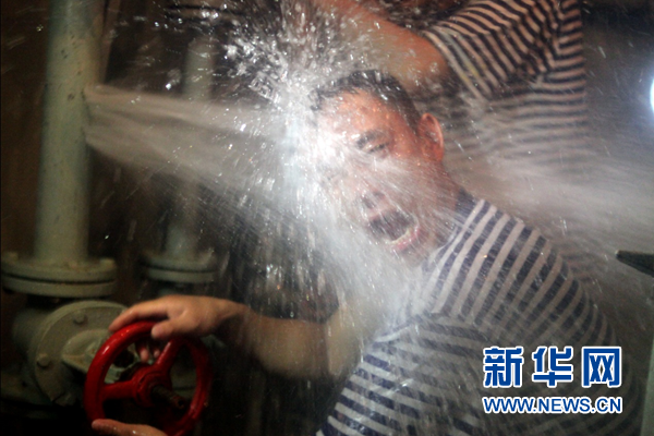 艇员正在进行损管堵漏训练。新华网发 (海军某潜艇支队供图)
