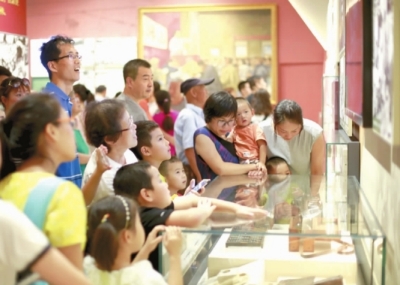 7月27日,在中国人民革命军事博物馆举办的“铭记光辉历史 开创强军伟业――庆祝中国人民解放军建军90周年主题展览”正式对公众开放,前来参观的观众络绎不绝。团体和个人观众均可通过军博官方网站、微信公众号等平台自助预约参观;未预约的个人观众,也可于参观当日凭有效证件到票务中心窗口领票。图为观众在参观展览。 本报记者 王清彬摄/光明图片